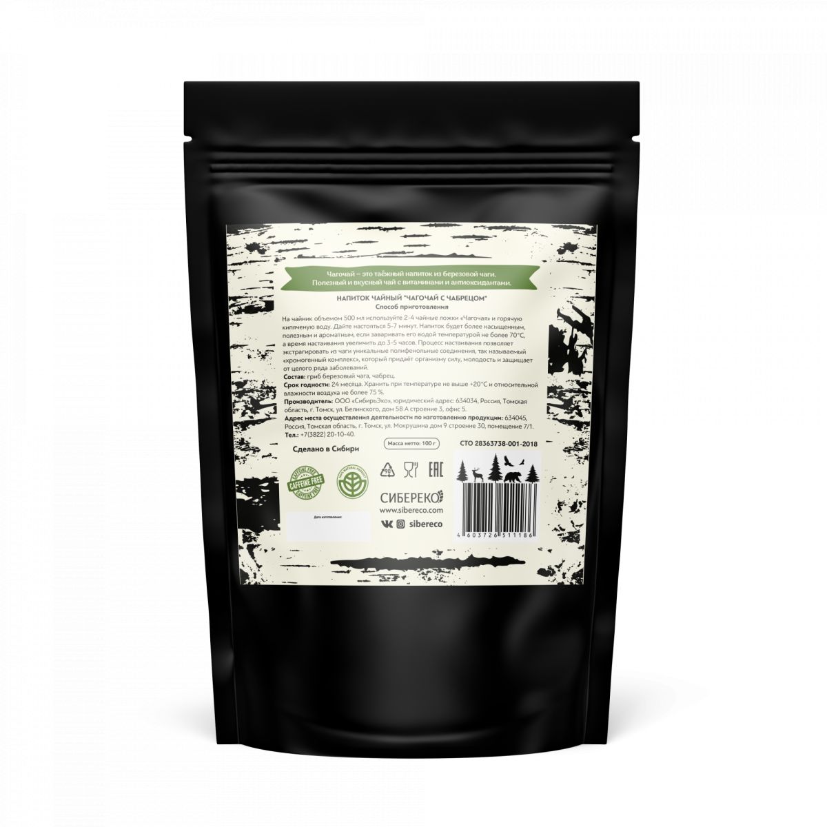 Состав: Чага (берёзовый гриб) молотая, чабреца трава (молотая).