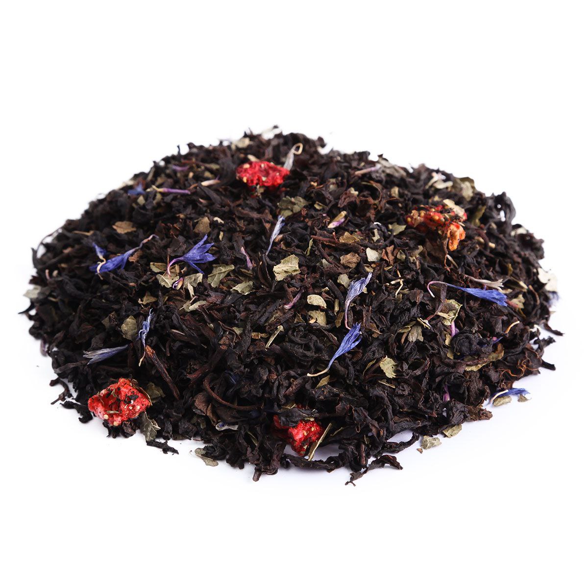Черный индийский чай Ассам с праздничным ароматом игристого шампанского с добавлением сочных ягод клубники. В напиток добавлены рубленый клубничный лист и кусочки натуральной клубники. Украшен лепестками василька.