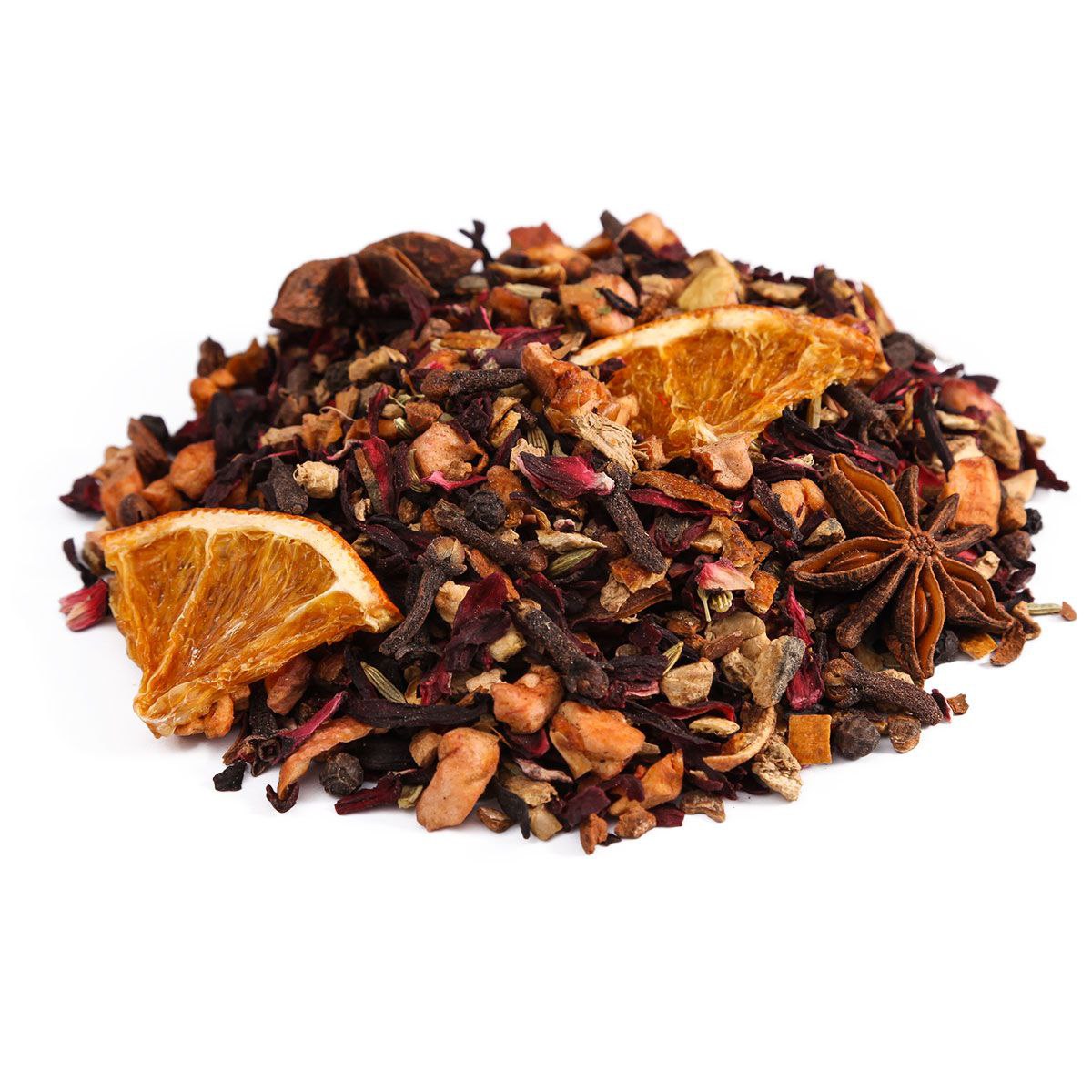 Натуральный пряный напиток на основе измельченных цветков суданской розы (гибискуса), цедры и долек апельсина, кусочков яблока с добавлением корицы, имбиря, гвоздики, фенхеля и бадьяна.