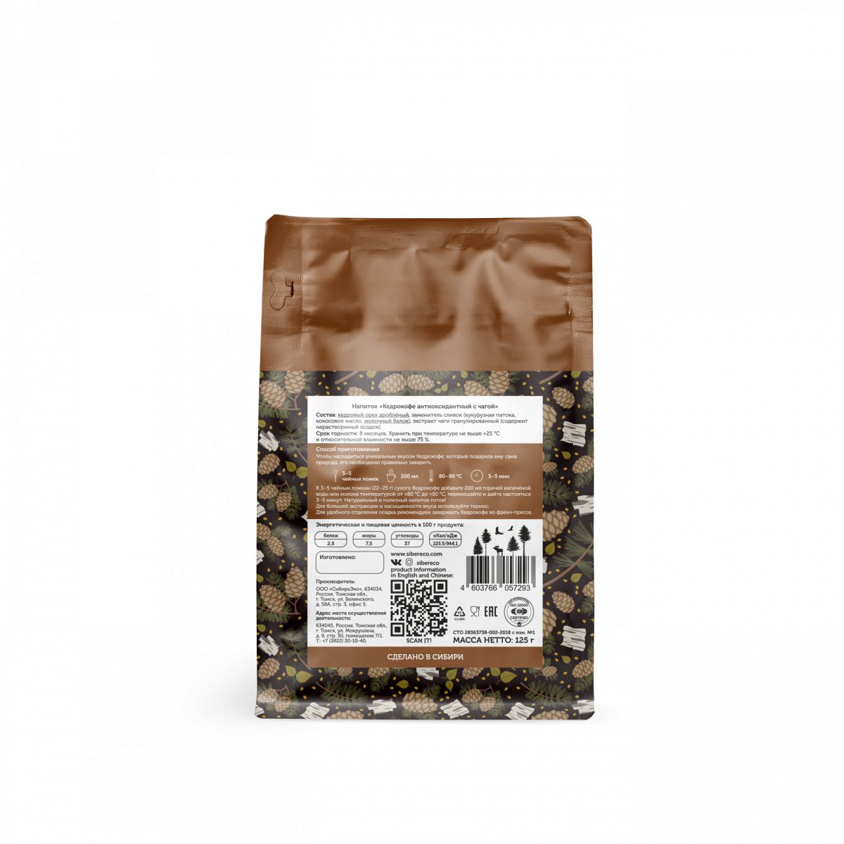 Состав: Кедровый орех дроблёный, заменитель сухих сливок на растительной основе (патока крахмальная, масло кокосовое, казеинат натрия), чага (берёзовый гриб) молотая