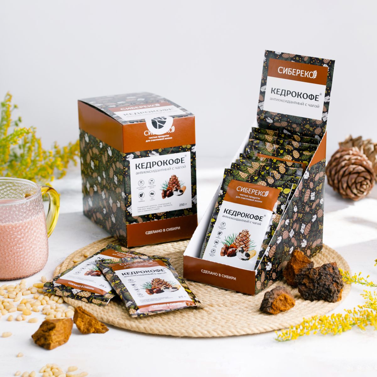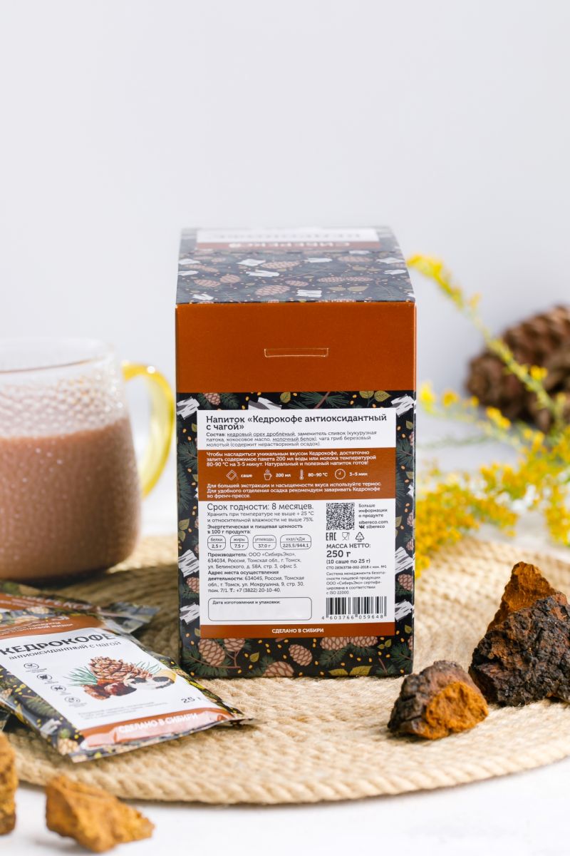 Кедрокофе антиоксидантный - напиток, стоящий на страже вашего здоровья! Экстракт чаги гранулированный в составе - мощнейший антиоксидант, помогающий организму в борьбе с агрессивным влиянием свободных радикалов на ДНК и белки клеток. В шоу-боксе 15 саше-пакетов, которые удобно хранить дома и брать с собой в путешествие или на работу.