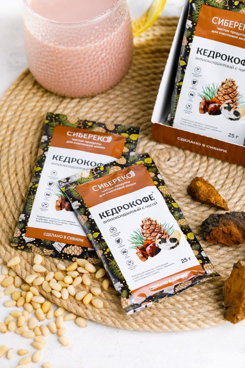 Состав: Кедровый орех дроблёный, заменитель сухих сливок на растительной основе (патока крахмальная, масло кокосовое, казеинат натрия), чага (берёзовый гриб) молотая.