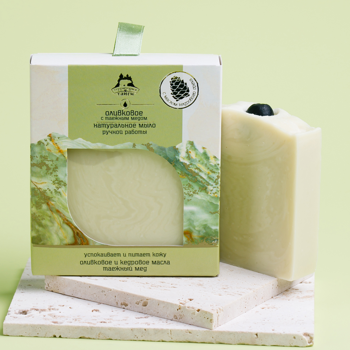 Натуральное мыло ручной работы в подарочной упаковке для рук и для тела с органическими маслами и легким ароматом. Наше органическое мыло без мыльной основы, сваренное с нуля холодным способом. Максимально бережный уход даже за чувствительной кожей взрослых и детей. 100% натуральный состав на основе масел, который подойдет для ежедневного дневного и вечернего ухода в любое время года, как морозной зимой, так и жарким летом. Омыленные масла оливы, кедра и таежный мед мягко очищают кожу от загрязнений без сухости и ощущения стянутости кожи. Оливковое масло и мед глубоко питают кожу и помогают устранить шелушения, делая кожу ухоженной и гладкой. Нежный сладковатый аромат понравится всем, кто тщательно подбирает ароматы и не любит ярко выраженных отдушек, рекомендуется также людям, склонным к аллергиям. Ароматное мыло не только будет служить как уходовое очищающее средство, но и станет дополнительным источником увлажнения кожи. Масла в составе мыла также помогут устранить сухость кожи и ускорят регенерацию, снимут воспаления и дадут омолаживающий эффект. Наше мыло не содержит спирта, без консервантов – безопасный состав. Порадуйте себя и своих близким кусочком ароматного натурального мыла от Территории Тайги! Мы любим природу и бережно используем ее ресурсы, поэтому наша натуральная косметика не тестируется на животных и безопасна для окружающей среды.